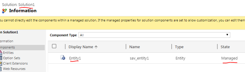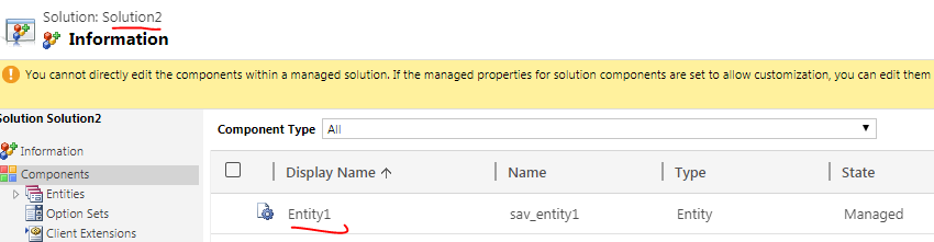- Delete managed solution Solution1 from your Production instance. This will delete solution and its component but Entity1 will remain in your Production Instance due to Solution2.