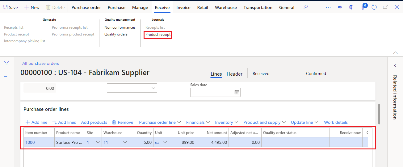 7. Upon cancellation, go to the same product receipt journal --> go to lines fast tab --> you can see that the received quantity is reduced to 0 and earlier received quantity is shifted to remaining quantity field for each line in the cancelled product receipt journal