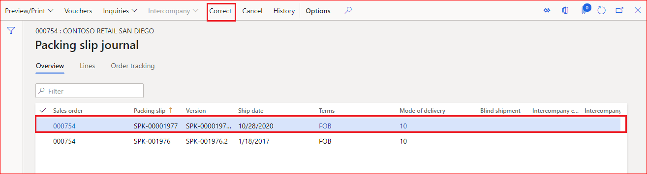 3. Select the packing slip which was wrongly posted. You can see Correct and cancel buttons are enabled
