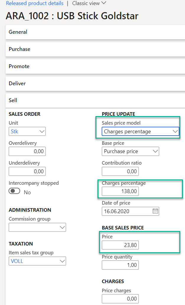 Here I show you how to produce at a net sales price on the product master data (sales base price). This can be done using the “Sales price model” as “Contribution ratio” or “Charges percentage”.