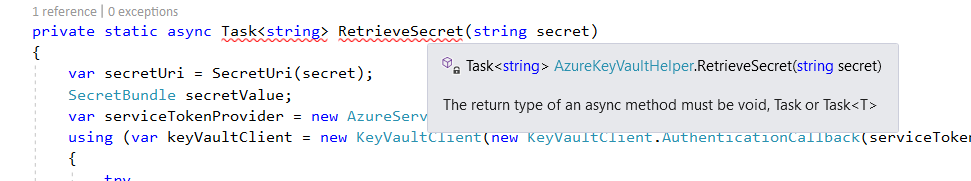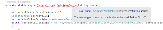 Today I was working on the some work related to KeyVault and I have written async method. The code was error as below.