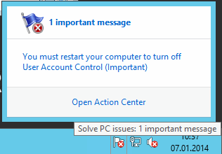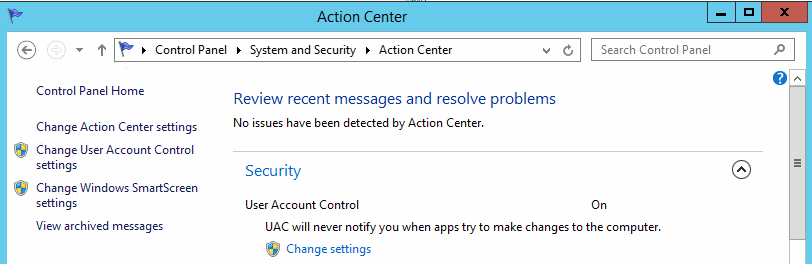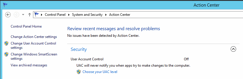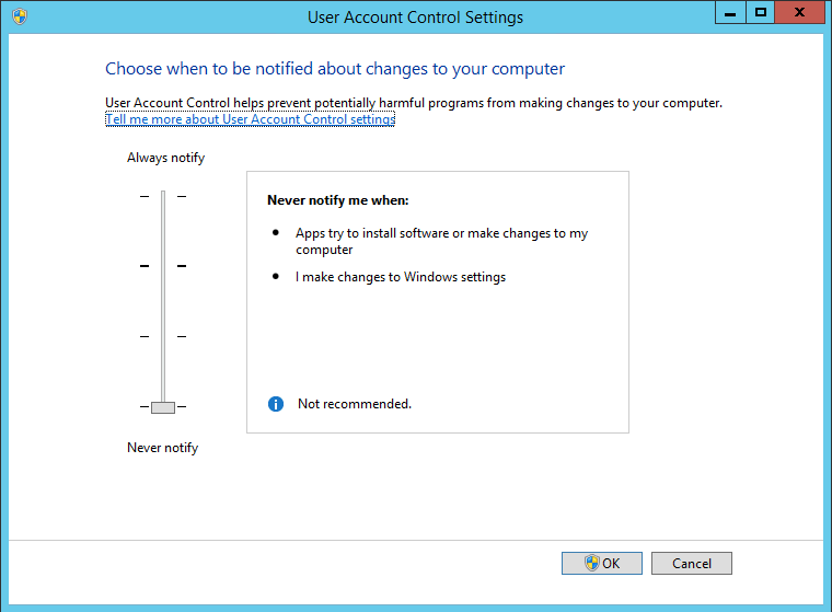 So if you were to load User Access Control and turn it down to "Never notify", you might think that UAC is off. Well, it is not. Even if you restart the server, it is not.