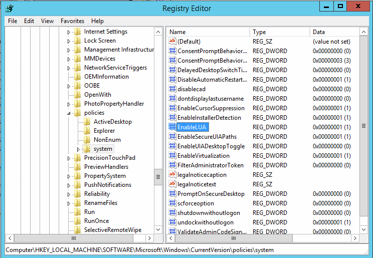 I noticed that User Access Control (UAC) was still on on my Windows 2012 R2 box, even though I had turned it off in Control Panel. So I went through the process of turning it off the hard way. While doing so I sort had to think over why I want to turn it off. There are several good arguments to keep UAC on, but there's also reasons to just get it out of the way. UAC creates additional obstacles for any operation that might cause your system to fail, but if you're like me, you are constantly changing stuff on the system, and most of these changes are protected by UAC. I'm willing to conclude that some of you might want to turn UAC off, so here is how to on Windows 2012 R2 (as far as I know).