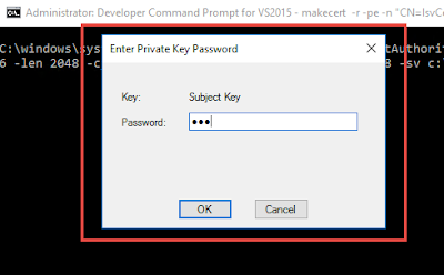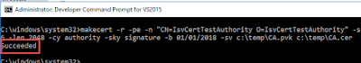 makecert -pe -n "CN=IsvCertTest O=IsvCertTest" -ss ISVStore -sr LocalMachine -a sha256 -len 2048 -cy end -sky signature -eku 1.3.6.1.5.5.7.3.3 -ic c:\temp\ca.cer -iv c:\temp\ca.pvk -b **/**/**** -sv c:\temp\isvcert.pvk c:\temp\isvcert.cer