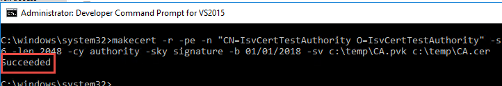 makecert -r -pe -n "CN=IsvCertTestAuthority O=IsvCertTestAuthority" -ss CA -sr LocalMachine -a sha256 -len 2048 -cy authority -sky signature -b 01/01/2020 -sv c:\temp\CA.pvk c:\temp\CA.cer