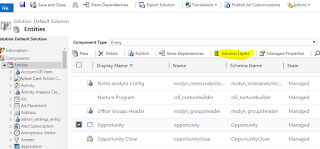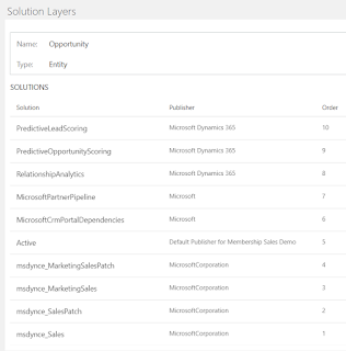 In Dynamics 365 Online, you may have recently noticed a new button within an unmanaged solution, 'Solution Layers'. I first saw this appear around 17th Mar 2019, and it's a welcome tool to help understand more what happens with multiple solutions in a system.