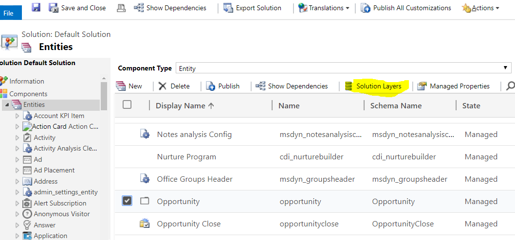 Note that, in the example above for the Opportunity entity, you several solutions were listed, but many don't have any changed properties. I think this is mostly because an entity will be included in a solution because one of its subcomponents (e.g. a view) has changed. To see this, you'd have to open Solution Layers on the subcomponent.