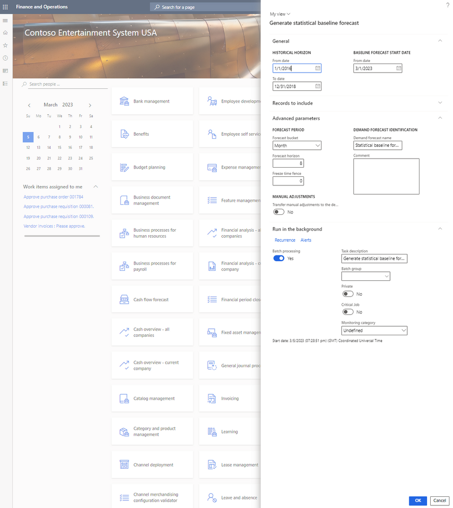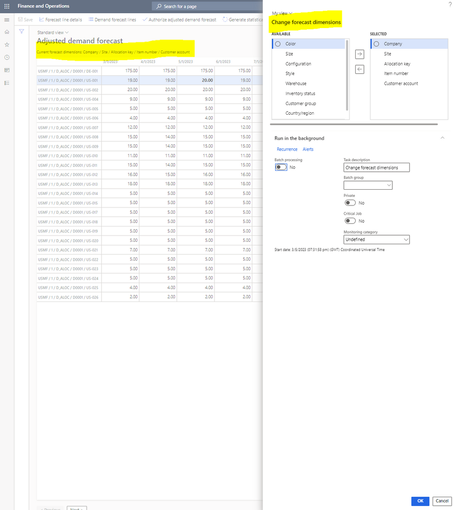 When generating the statistical baseline forecast we can select the forecast buckets (month, day, weeks) The number of buckets to generate a forecast for is set in the Forecast horizon field. Please note that if you are using the forecast strategy Copy over historical demand, the end of the historical horizon is ignored. In our case we use azure ML service so we use that field. To prevent confusion in master plans, a certain number of forecast buckets can be frozen. This number is set in the Freeze time fence field. On the Adjusted demand forecast page, the cells for the frozen buckets are disabled. (can’t be adjusted) Manual adjustments made in previous demand forecasting iterations can be automatically applied to the new baseline forecast if the Transfer manual adjustments to the demand forecast check box is selected. I can run it in batch and with reoccurrence if I want.