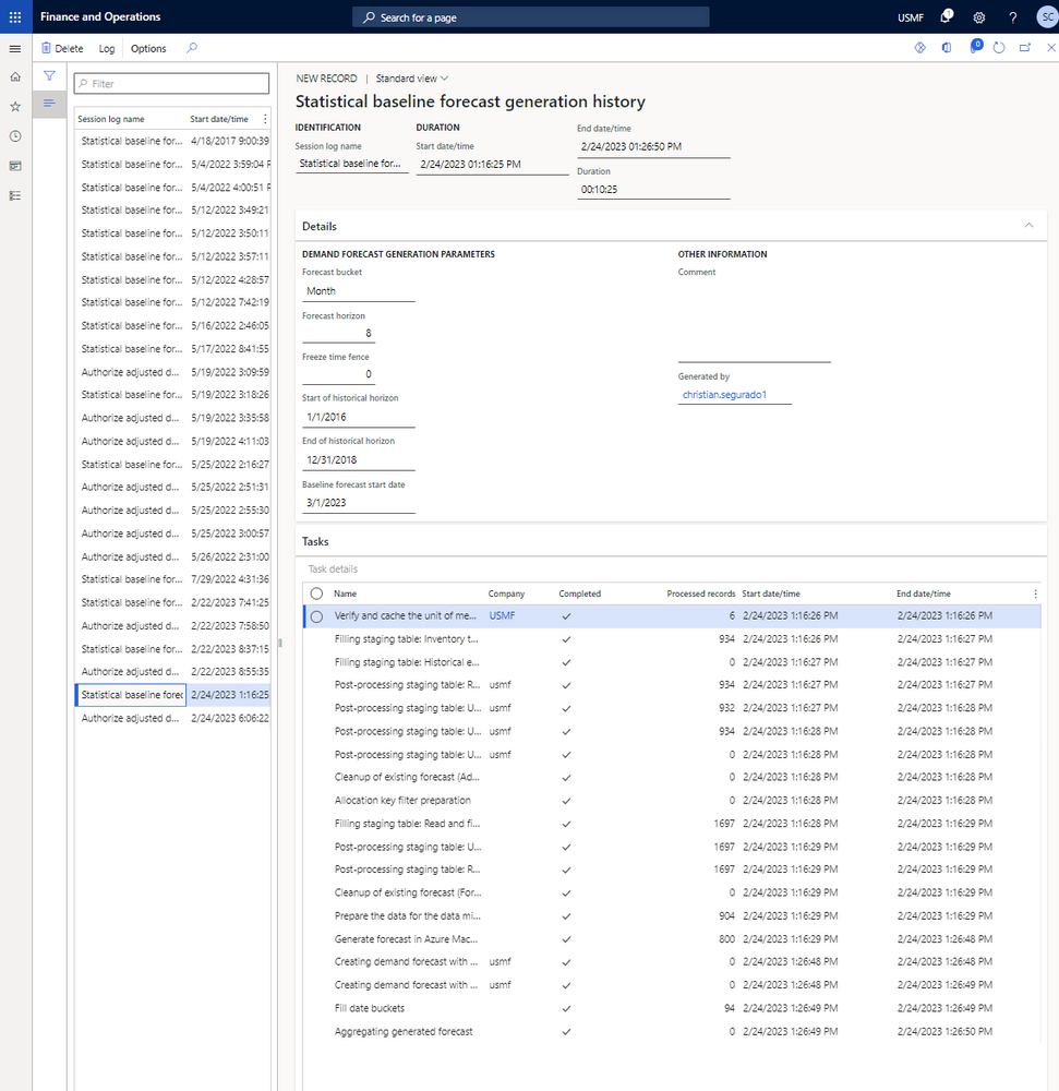On the Statistical baseline forecast generation history page, you can review the past run. (select Statistical baseline forecast on the left hand side under session log time) – you can see what steps/tasks the system went through – it filled e.g. 934 records to the staging table.