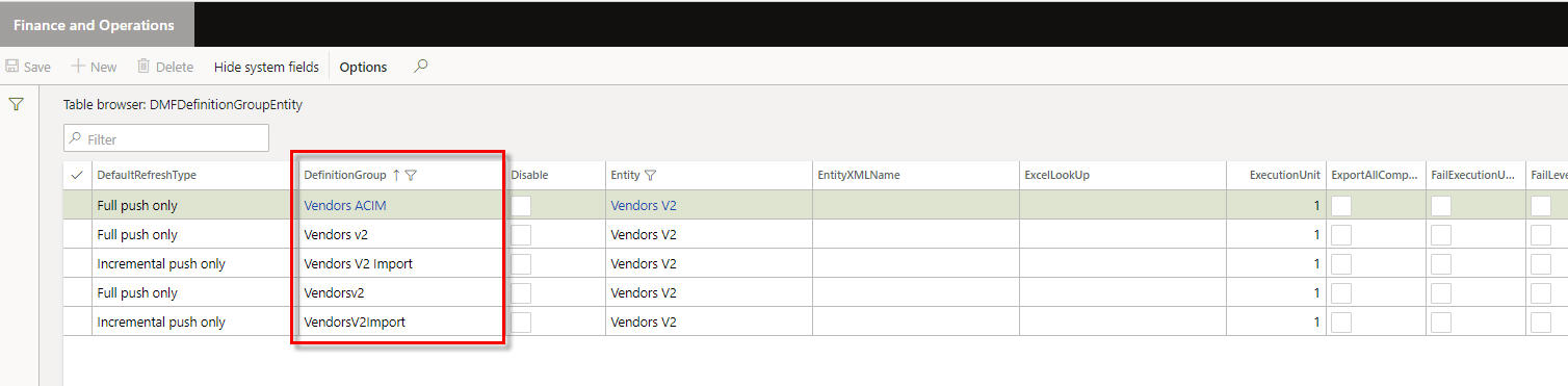Browse the environment by appending this part /?mi=SysTableBrowser&TableName=DMFDefinitionGroupEntity&cmp=USMF at the end.