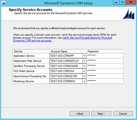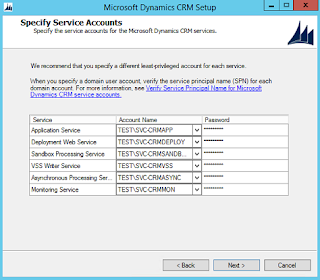 - Next, specify the service accounts used for CRM, domain\username followed by passwords. Still the same 6 service accounts as in CRM 2013 and 2015