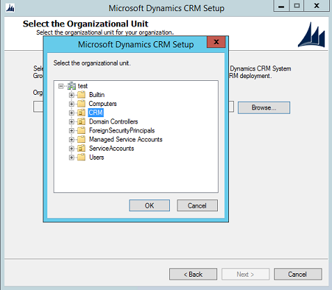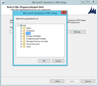 - Select the OU where you want to create the CRM groups. CRM 2016 (and the previous three versions) create 4 groups used for various purposes. If you want to create them manually you'll have to specify them in a config-file used for installation. I'll add some words of wisdom regarding unattended installation in a future blogpost, including what to do with those pesky encryption keys. In the meantime, here's the doc for the xml config (technet)