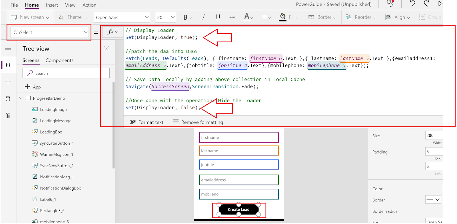 Patch(Leads, Defaults(Leads), { firstname: firstName_6.Text },{ lastname: lastName_5.Text },{emailaddress1: emailAddress_5.Text},{jobtitle: jobTitle_4.Text},{mobilephone: mobilephone_5.Text});