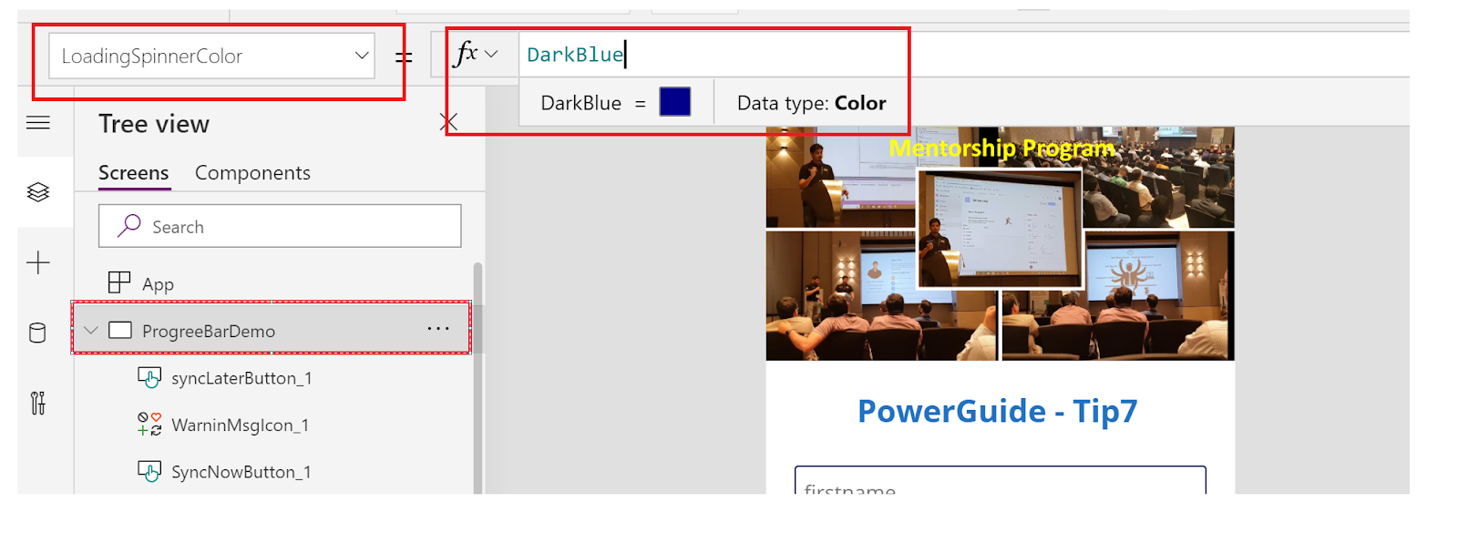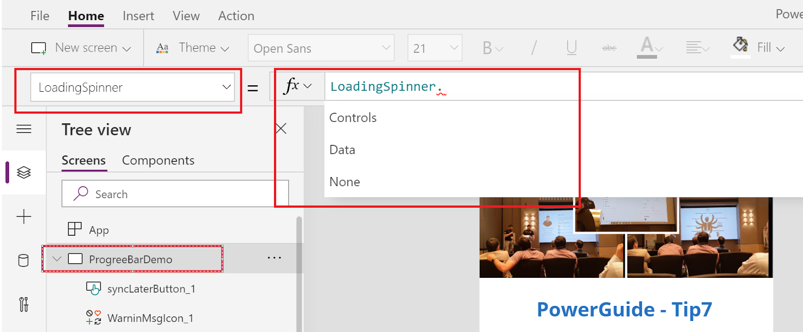 - LoadingSpinner.Data - Setting it's value to Data means, it will show the Loading Spinner unless all the data gets retrieved on the screen from the defined data source