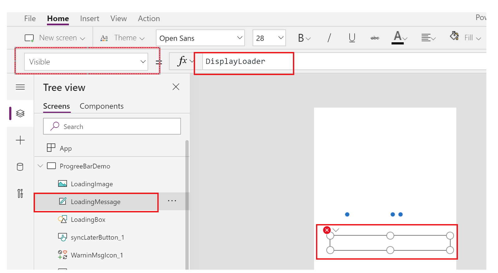 Note: After setting a Variable (DisplayLoader) name, you'll get an error on the controls. Please ignore it for the time being. It is because we didn't set its value yet anywhere on the screen.