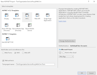 I'm going ahead and creating a new Web Application project in Visual Studio. I'm not worrying about hosting and which functions I'll need, so I'll just set up a simple MVC project with defaults. I'm also going ahead and creating a unit test project at the same time, which will be used to demonstrate mocking a bit later on.