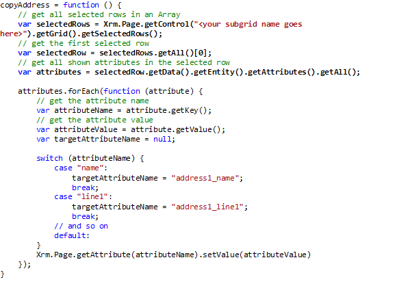 I have added a subgrid to the Account form and added the composite field of Address1. In the Command bar, I added a custom button and called it Copy Address. This button has custom logic that accesses the grid control, gets the selected row and copies each attribute to the Address1: Name and Address1: Composite field. The grid control is aware of the added columns to the view and not the entire fields of the entity.