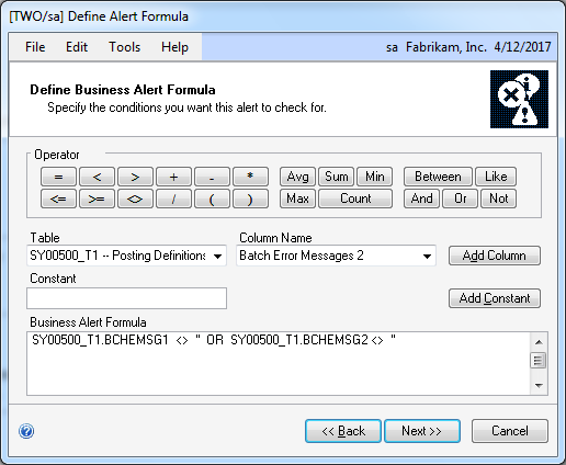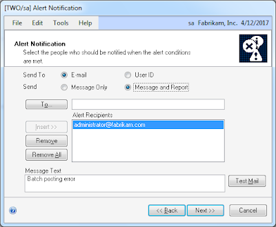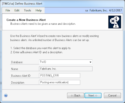 Q: Is it possible to setup a GP Business Alert to notify someone when a scheduled SOP batch (or any other GP batch) fails to post? The background to this is we are using MC2 GP Agent module to autopost the imported SOP invoice batches. This will happen many times a day. To avoid the need for a person monitoring the automated posting process, we want an alert to be generated when the posting process fails.The response comes courtesy of Dave Bader, Moderator of the Partner Online Technical Community, enhanced by me with pictures to facilitate the explanation.