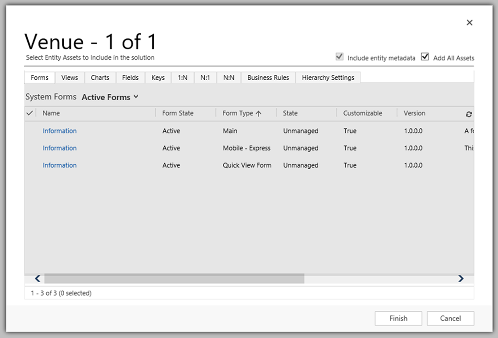 The other issue is with the metadata. When including an entity in a solution, there is the option to include entity metadata, which includes things like “Notes” and “Activities”, and whether they’re enabled for an entity. Once the entity has been added to the solution there is no way to tell whether the metadata has been included also. In this instance you may need to again remove then re-add the entity with the include metadata option checked – which again, is a hassle. So perhaps in this instance if you are not the sole person using the solution, for the sake of ease of coordination it may make sense to include all child components.