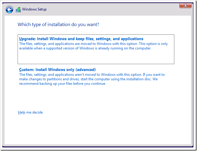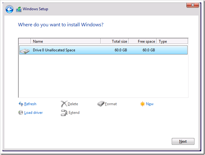 From the screen above, I selected Custom: Install Windows only (advanced) option.