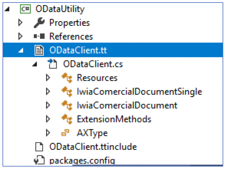 Agregar un nuevo proyecto de aplicación de consola (IwiaODataClient) y agregar las referencias para ADD, OData client, JSON, etc. Explicado en el link https://community.dynamics.com/ax/b/axaptatodoesposible/archive/2018/09/23/desaf-o-9-instalaci-n-paquetes-para-autenticaci-n-aad-y-dataentity-cliente