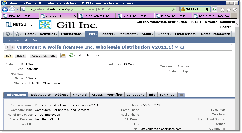 With NetSuite, you have the nice feature of being able to right click on a menu item or link and open it in a new browser tab. You can have multiple customers open in multiple tabs, or multiple invoices, or multiple reports or inquiries. The navigation is very flexible and fluid, allowing you to go wherever you want from anywhere. This is pretty appealing, but as I noted, you can quickly get lost in a pile of browser tabs.