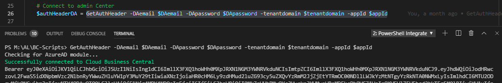 $authHeaderDA = GetAuthHeader -DAemail $DAemail -DApassword $DApassword -tenantdomain $tenantdomain -appId $appId