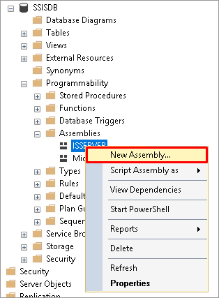 Open your SQL Management Studio and navigate to SSISDB. Expand the Programmability node, expand the Assemblies node and right-click an assembly you need to update (ISSERVER in this example).