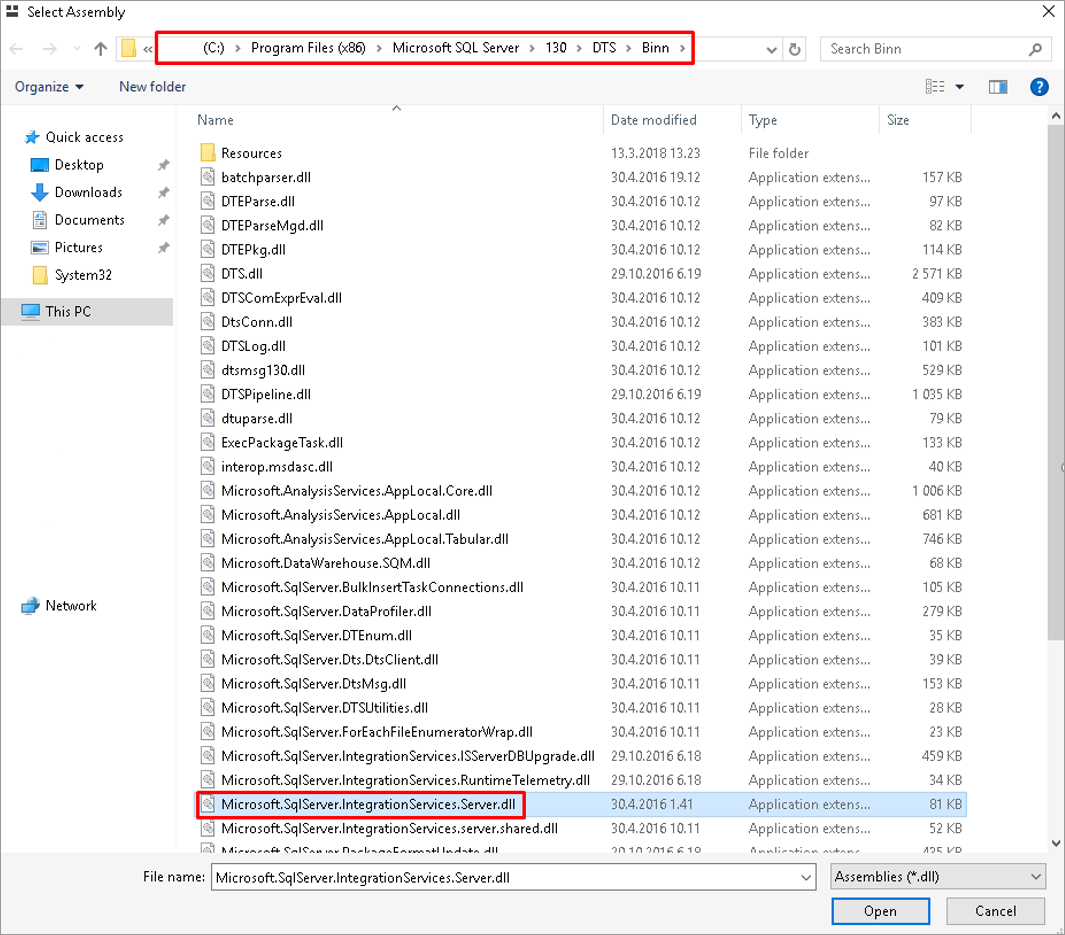 Microsoft.SqlServer.IntegrationServices.Server.dll file is an assembly you are looking for. To find it, go to your SQL installation directory and navigate to Program Files (x86)\Microsoft SQL Server\130\DTS\Binn, locate the forementioned .dll file and click Open.