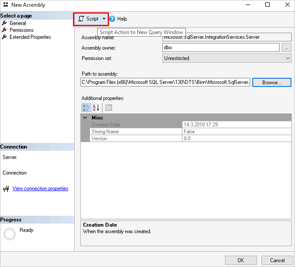 Note: It is likely that your assembly name and PERMISSION_SET parameters might be different. Make sure you change them in accordance with original assembly parameters. See your assembly’s Properties window to ensure all the parameters entered in SQL statement are correct.