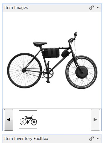 In this screenshot the add-in control is on a page in a factbox subpage. There is a main image (defaults to the first thumbnail image), three thumbnails and buttons to scroll between pages of images. In this case, you can see there is at least one more image on the next page of thumbnails, because the right arrow is enabled.