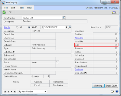 - Item Quantity Master or Item Quantity Inquiry retrieves data from IV00102, which stores quantities in base unit of measurement, it recalculated associated quantities after every single inventory-related transactions (IV, SOP, POP ...etc). The quantity sold in IV00102 is calculated based on the following equations