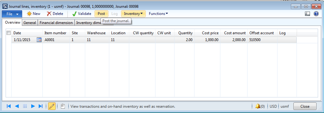 8. Click on Post button to post the journal to get an inventory and financial impact.