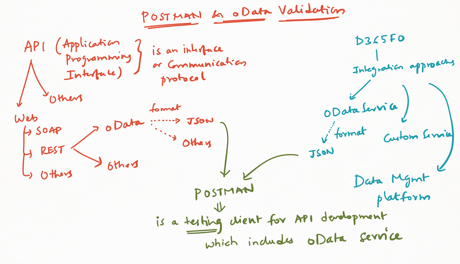Just to give you a context around, API, different types of API and D365FO, different integration approaches in D365FO and oData service (format=JSON) - I have tried to illustrate the relation in the below picture.