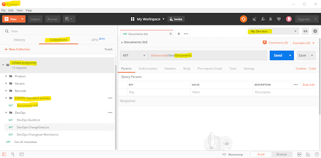 For my example here, {{resource}} would convert to https://mydevbox.cloudax.dynamics.com. So when I push the Send button.. the actual request would be,