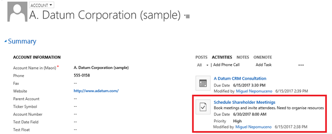 Then in my Dynamics 365 environment, I tested the connection by making an Activity record for the Account record “A. Datum Corporation”. Highlighted below is the Meeting I’ve created for that Account record in Microsoft Dynamics 365.