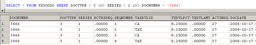 SELECT * FROM TX30000 WHERE DOCTYPE = 3 AND SERIES = 1 AND DOCNUMBR = 'XXXX'