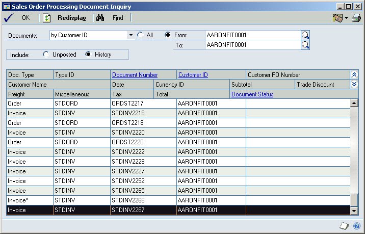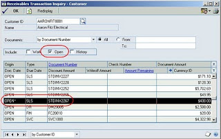 Verify the transaction under the Receivables Transaction Inquiry window (Inquiry -> Sales -> Transactions by Customer)