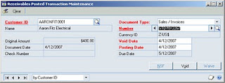 They imported SOP invoices with non-inventory line items from their operations system to GP, and each invoice number matched the project number from their operations system, keeping things nice and tidy. Apparently an employee found a mistake in one of the imported invoices, and instead of deleting the invoice and reimporting it before posting, the employee voided the receivables transaction associated with the invoice after it had been posted. Because the voided transaction was using the invoice number in GP, they were unable to re-import the corrected invoice with the same invoice number. There were probably a few alternatives to re-using the same invoice, but those would cause some problems for them down the road when it came to their reporting and reconciliation.