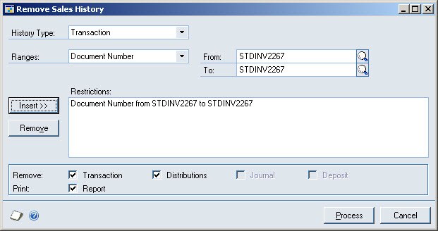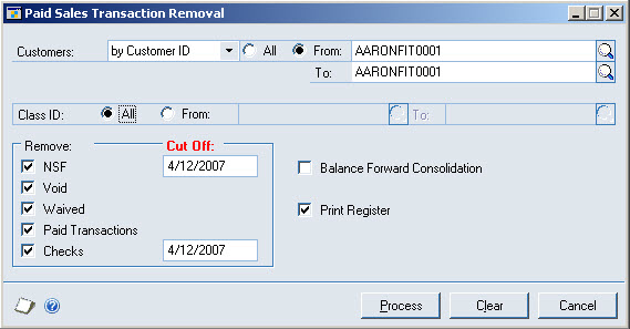 Open the Remove Receivables Transaction History window (Tools -> Utilities -> Sales -> Remove Transaction History).