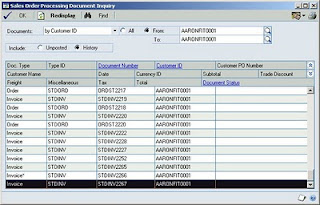 You can see that even though the receivables document no longer appears in the Receivables Transaction Inquiry window, you can still see the sales document in the Sales Order Processing Document Inquiry (Inquiry -> Sales -> Sales Documents)