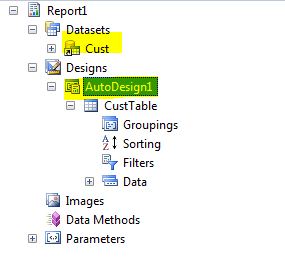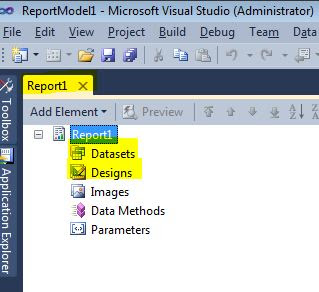 - The nodes available under the Report1 are Datasets, Desgins, Images, Data methods & Parameters. And for a simple SSRS report, our task will be to create something under the Datasets & Designs and then bind the two. Dataset - would be a tabular set of data that we will get from Ax. We will use Ax queries to get the data for this example.