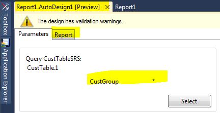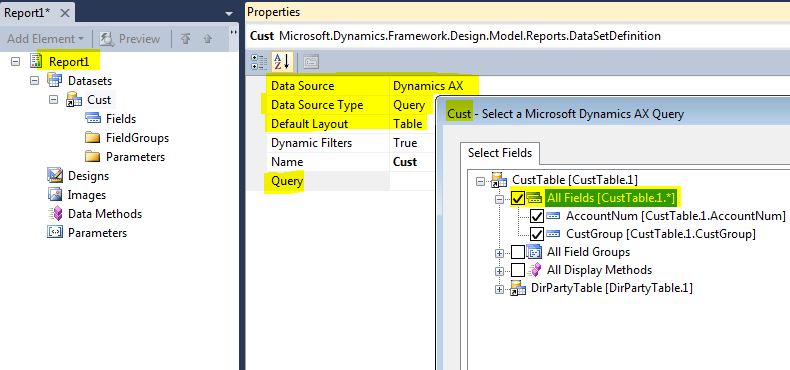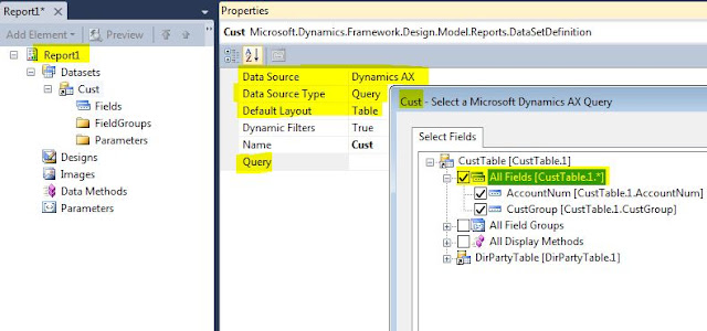 For selecting query, click on the ellipses and then select appropriate Ax Query ( I selected CustTableSRS and then click next to navigate to a window to select fields needed (illustrated in below figure) - Select all fields and click ok. And you will find a query automatically populated in the Query property of Report1. Something like, SELECT CustTable.1.AccountNum,CustTable.1.CustGroup FROM CustTableSRS.
