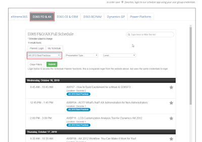 There are entire tracks of content dedicated to AX 2012. Including this great session I am presenting with my MVP cohort, the one, the only, Kelly Kane. The session is called Ask the Experts: Making the Most of AX 2012. And this session is just one of many in the AX 2012 Best Practices track. You can find and tag all the AX 2012 sessions in your session builder by visiting https://na.usergroupsummit.com/nasummit/conference-schedule/sessionsand then selecting AX 2012 Best Practices in the Track drop-down box.