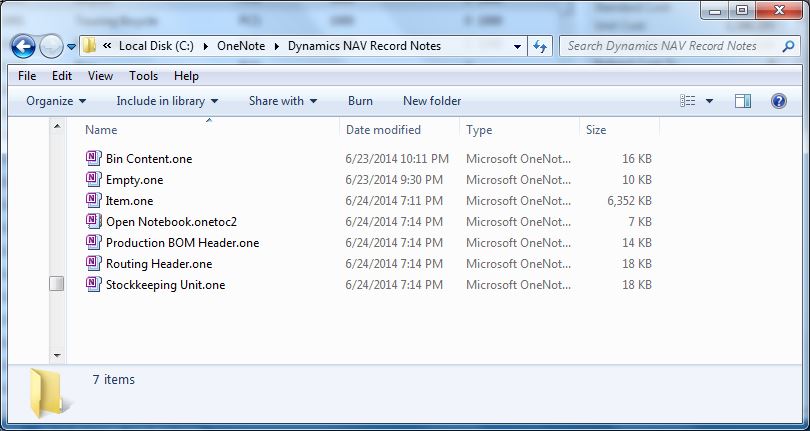 Dynamics NAV then creates one OneNote file per record type in the defined folders.