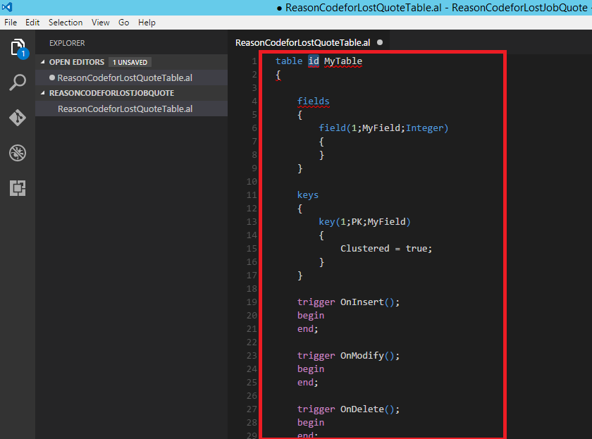 All functionality in Dynamics NAV are coded in objects. Table objects define the table schema that holds data, page objects represent the pages seen in the user interface and codeunits contain code for logical calculations and for the application behavior. These objects are stored as code, known as AL code, and are saved in files with the .al file extension.