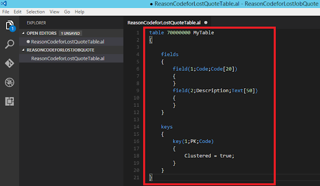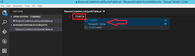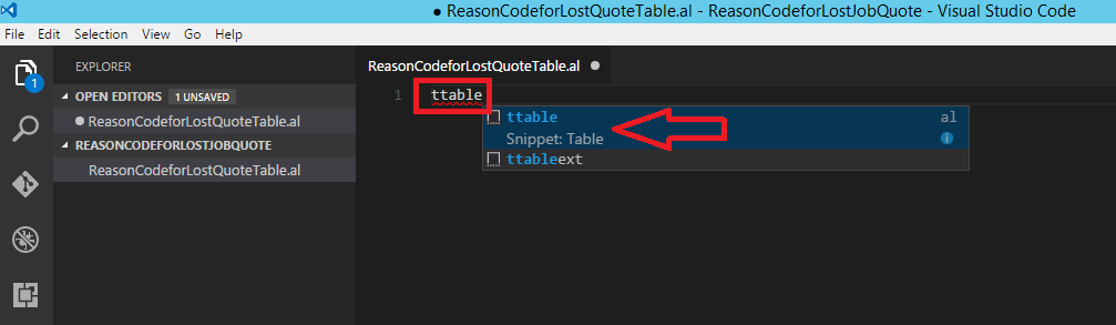 Typing the shortcut ttable will create the basic layout for a table object when using the AL Extension in Visual Studio Code.