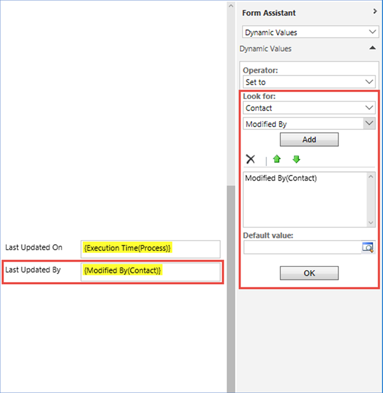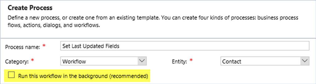 Note: The Last Updated On and Last Updated By fields do not need to exist on the Contact form in order for them to be updated by a Workflow Process. However, if they do they should not be Read-Only when configuring the Workflow Process otherwise you will not be able to configure them within the Update step of the Workflow Process. If required, you can temporarily remove these fields from the form or make them not Read-Only, configure the Workflow Process and then re-add the fields to the form and/or make them Read-Only again; remembering to publish the changes to the form each time.