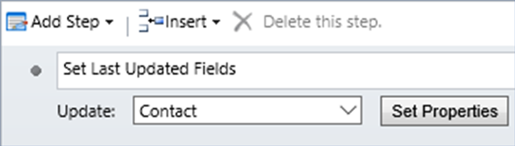 Thirdly, the Workflow Process is configured to update the Last Updated On and Last Updated By fields on the Contact to the current Date/Time and User using a single Update Contact step.