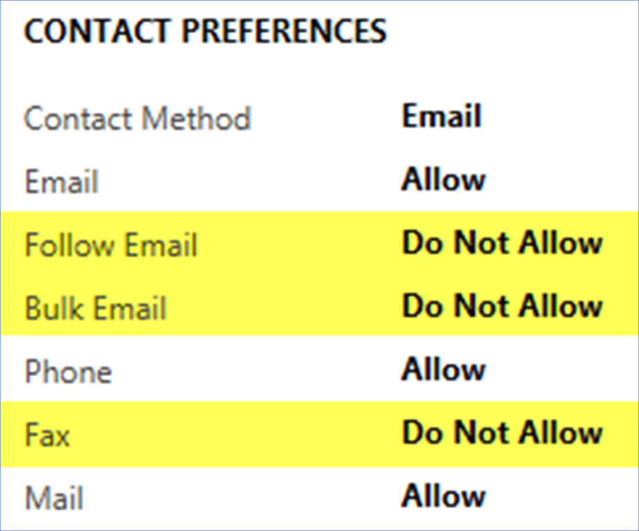 Finally, a user updates one or more fields that are not any of the designated fields on the Contact, such as their Contact Preferences for Follow Email, Bulk Email and Fax: